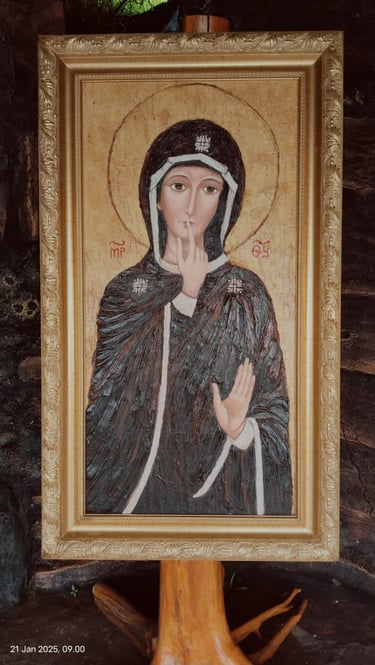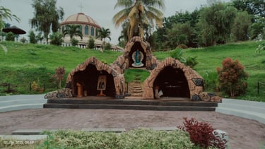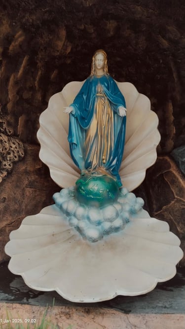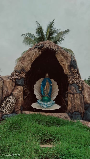 Dalam stasi ke-7, Maria dipresentasikan sebagai model Gereja dan teladan umat beriman, karena ia selalu taat dan mengikuti dorongan Roh Kudus sepanjang hidupnya. Sedangkan di stasi ke-8, di gua Maria, diri Maria ditampilkan sebagai Perawan mulia yang indah berseri sesudah melewati lika-liku penderitaan hidup (lambang mutiara), yang diangkat ke surga (dilambangkan lewat tangan Bunda Maria yang terangkat) dan dimahkotai di surga (dilambangkan dengan mahkota di atas kepala Maria). Dengan demikian, gua Maria sekaligus mempresentasikan peristiwa mulia ke-4 dan ke-5 dari Doa Rosario serta buah utama dari Kebangkitan Kristus.
